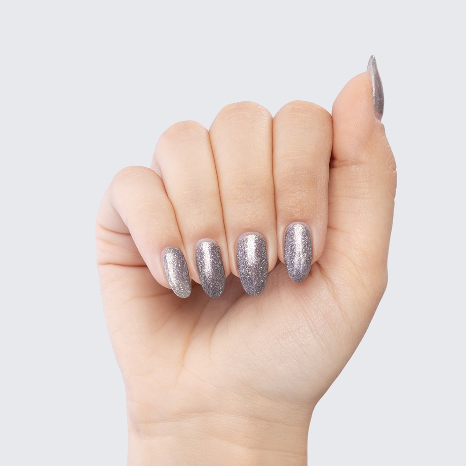 The metallic finish of this gunmetal-grey polish sets a shining example.