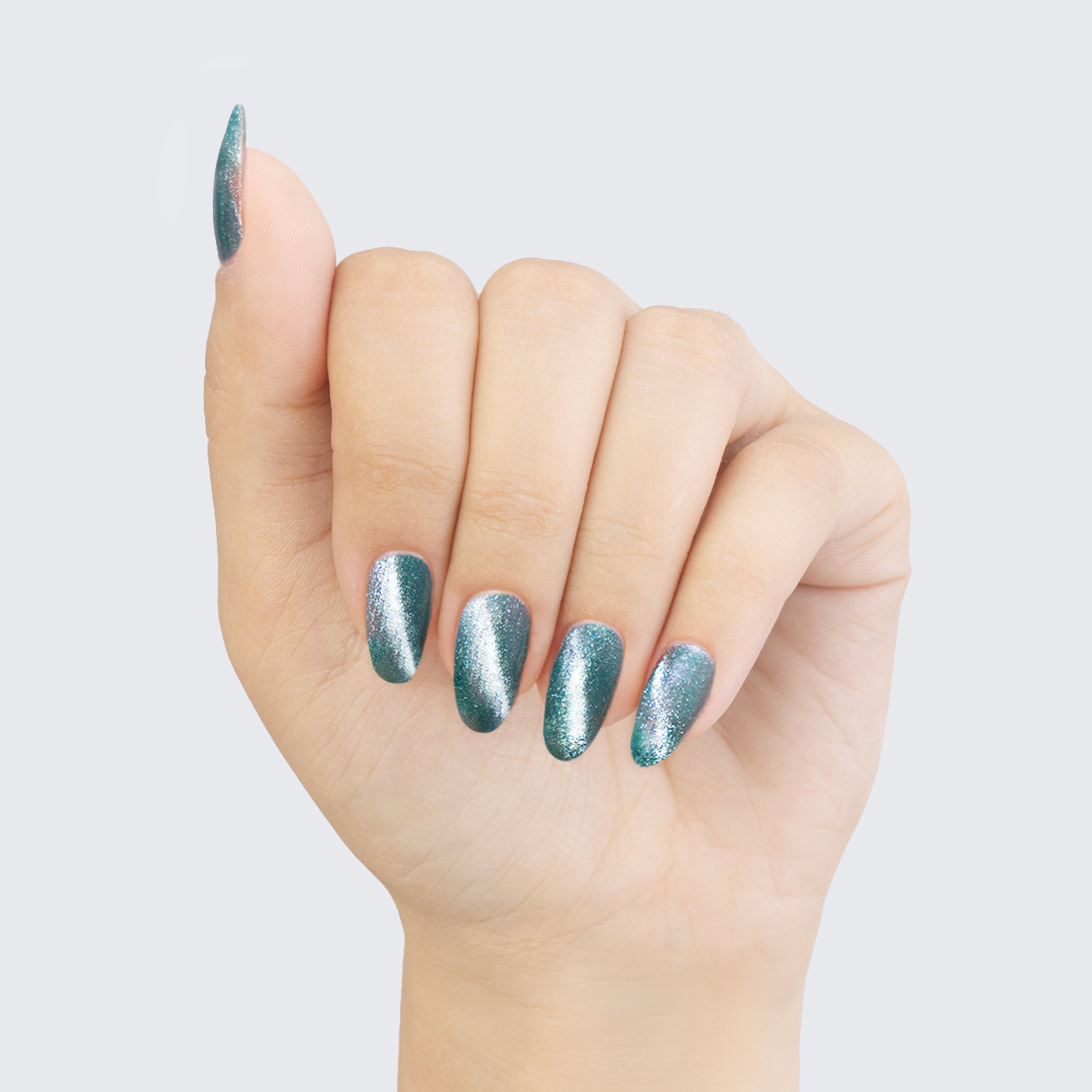 Teal. Dark. Silvery teal magnetic shimmer. Opaque. Cool undertone.